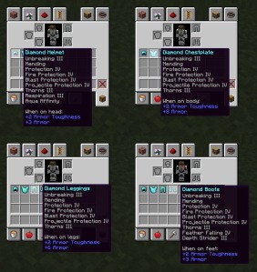 Чуть-чуть я поторопился и не всё проверил, согласен. В режиме выживания, похоже, ограничено количество одновременных зачарований. Наложить на предметы брони получается 6 зачарований за раз, но сочетать можно ранее не сочетавшееся. К примеру шлем в выживании без Unbreaking и Mending я смог зачаровать на Protection, Fire Protection, Blast Protection, Projectile Protection, Respiration и Aqua Affinity. А это тоже весьма читерный шлем получается. Так же и с другими элементами брони.