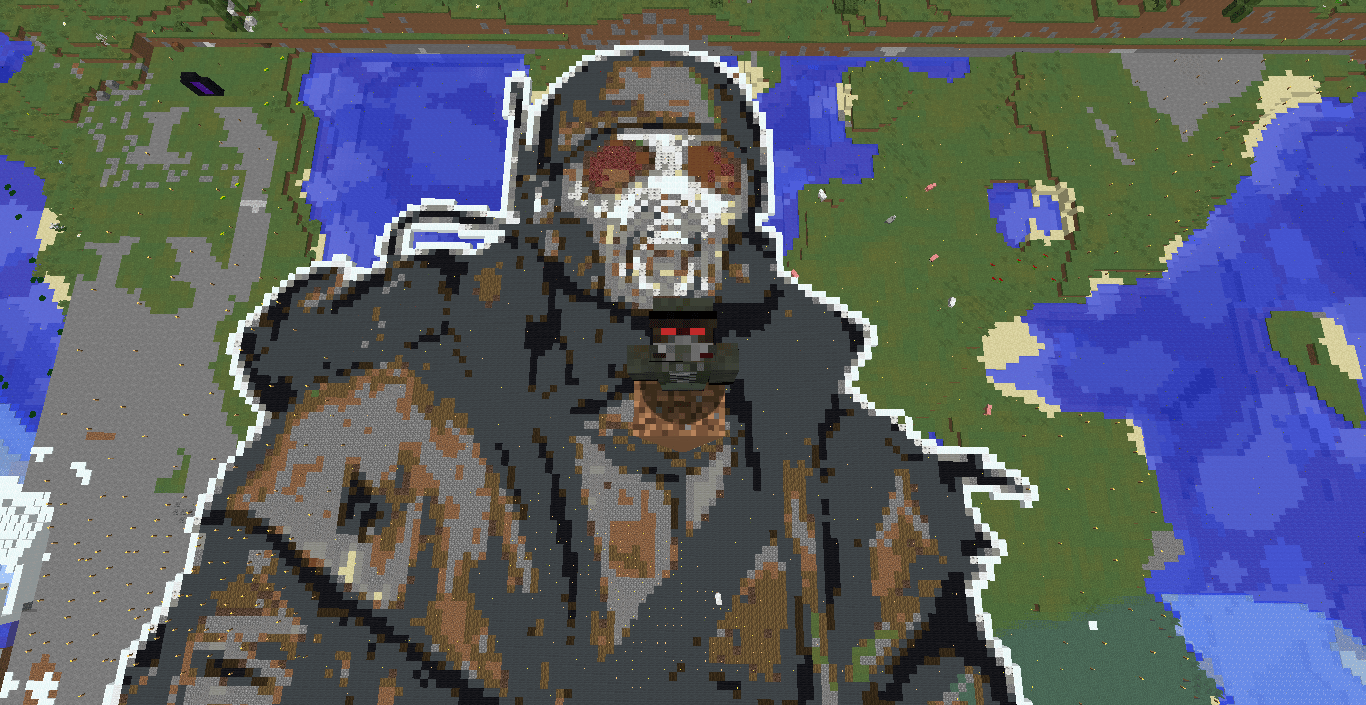 Пиксельарт на 93000 блоков, вымучивался мною больше года, а по сути был сделан за полторы недели (выравнивание площадки 300х400 и само строительство). Огромное спасибо Жене, ака _ris_, за 20к блоков серой шерсти, которые очень мне помогли в строительстве 🙂 Впереди еще восстановление ландшафта и мелкие доработки. Как то так.